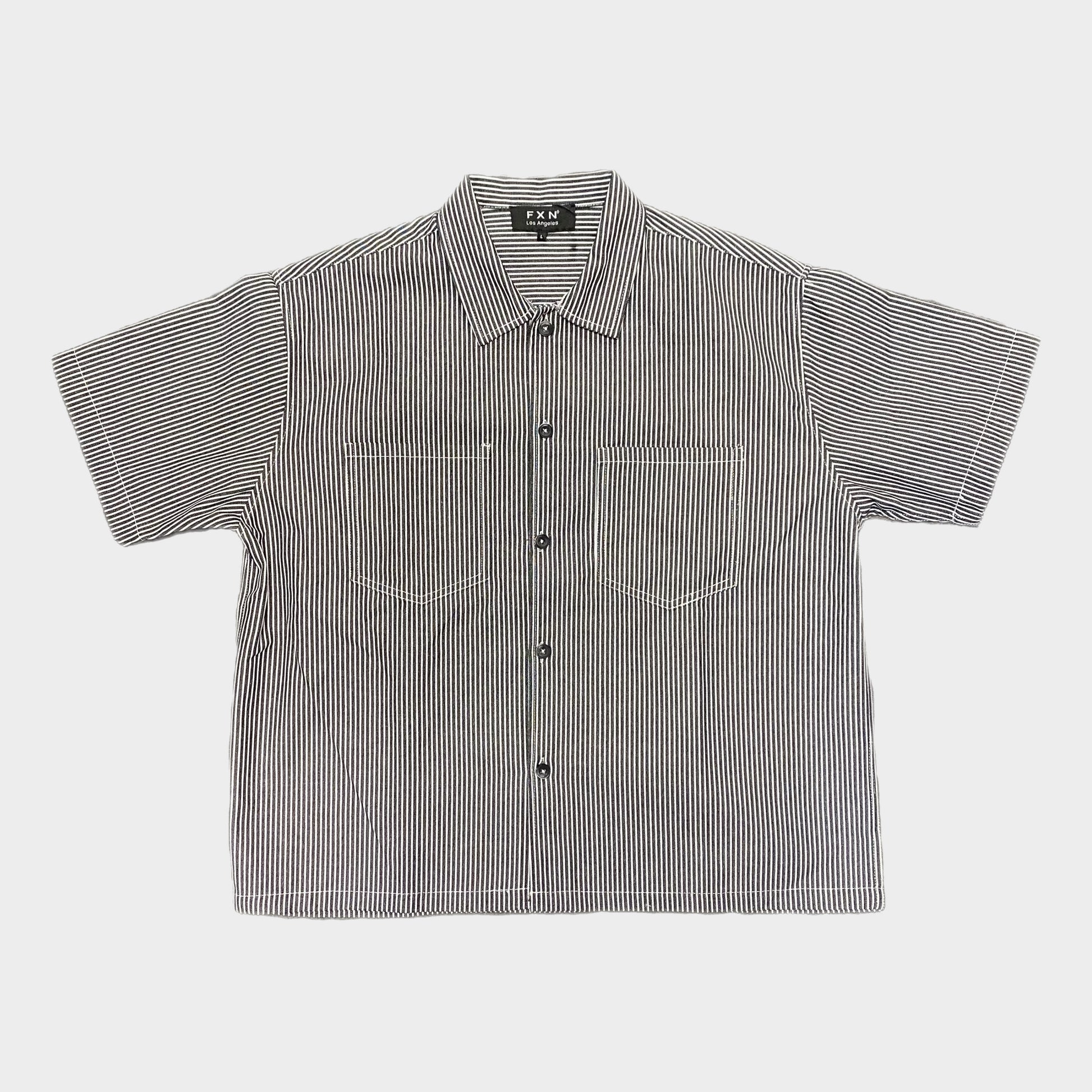 Our Cropped Hickory Button up features the classic workwear pin stripe pattern and two front pockets accentuated with buttons. The fit is cropped and boxy, best to style open or buttoned up. Now available in-store and online. For wholesalers with a license, sign up for wholesale account to see pricing.
