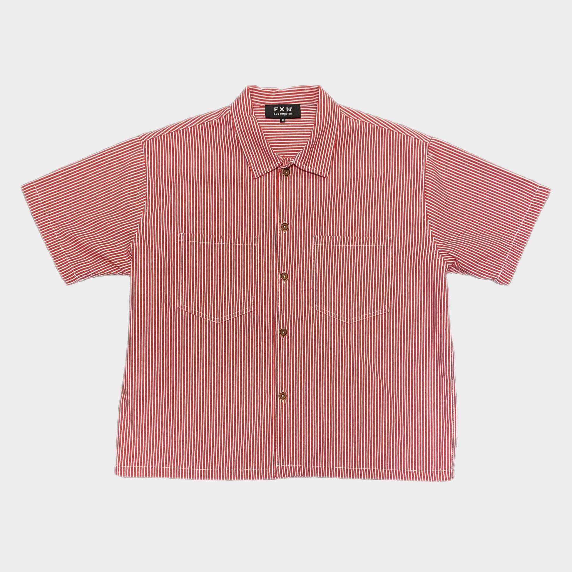 Our Cropped Hickory Button up features the classic workwear pin stripe pattern and two front pockets accentuated with buttons. The fit is cropped and boxy, best to style open or buttoned up. Now available in-store and online. For wholesalers with a license, sign up for wholesale account to see pricing.